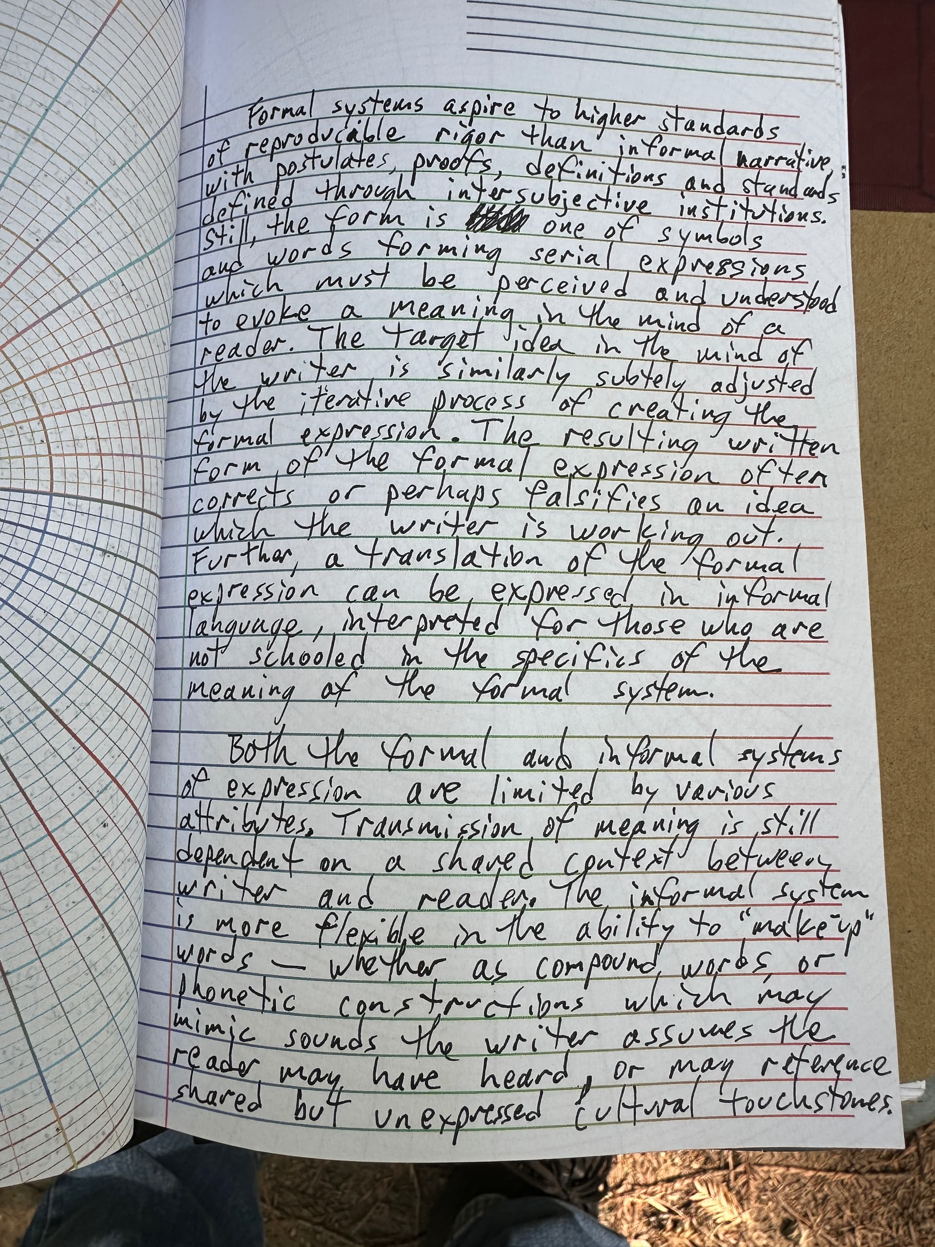 Formal systems aspire to higher standards of reproducible rigor than informal narrative — with postulates, proofs, definitions and standards defined through intersubjective institutions. Still the form is still one of symbols — only words forming serial expressions which must be perceived and understood to evoke a meaning in the mind of a reader. The target idea in the mind of the writer is similarly subtly adjusted by the iterative process of creating the formal expression. The resulting written form of the formal expression often corrects or perhaps falsifies an idea which the writer is working out. Further, a translation of the formal expression can be expressed in informal language, interpreted by those who are not schooled in the specifics of the meaning of the formal system.