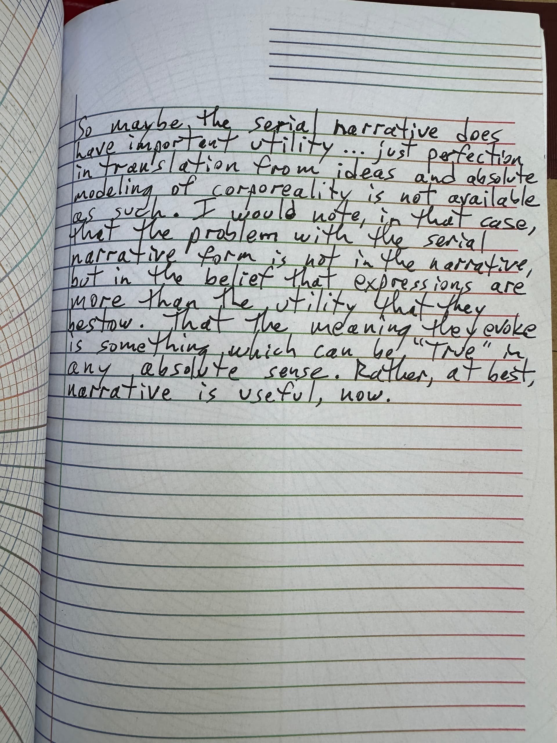 So maybe the serial narrative does have important utility… just perfection in translation from ideas and absolute modeling of corporeality is not available as such. I would note, in that case, that the problem with the serial narrative form is not in the narrative, but in the belief that expressions are more than the utility that they bestow, that the meaning they evoke is something which can be “true” in any absolute sense. Rather, at best, narrative is useful, now.