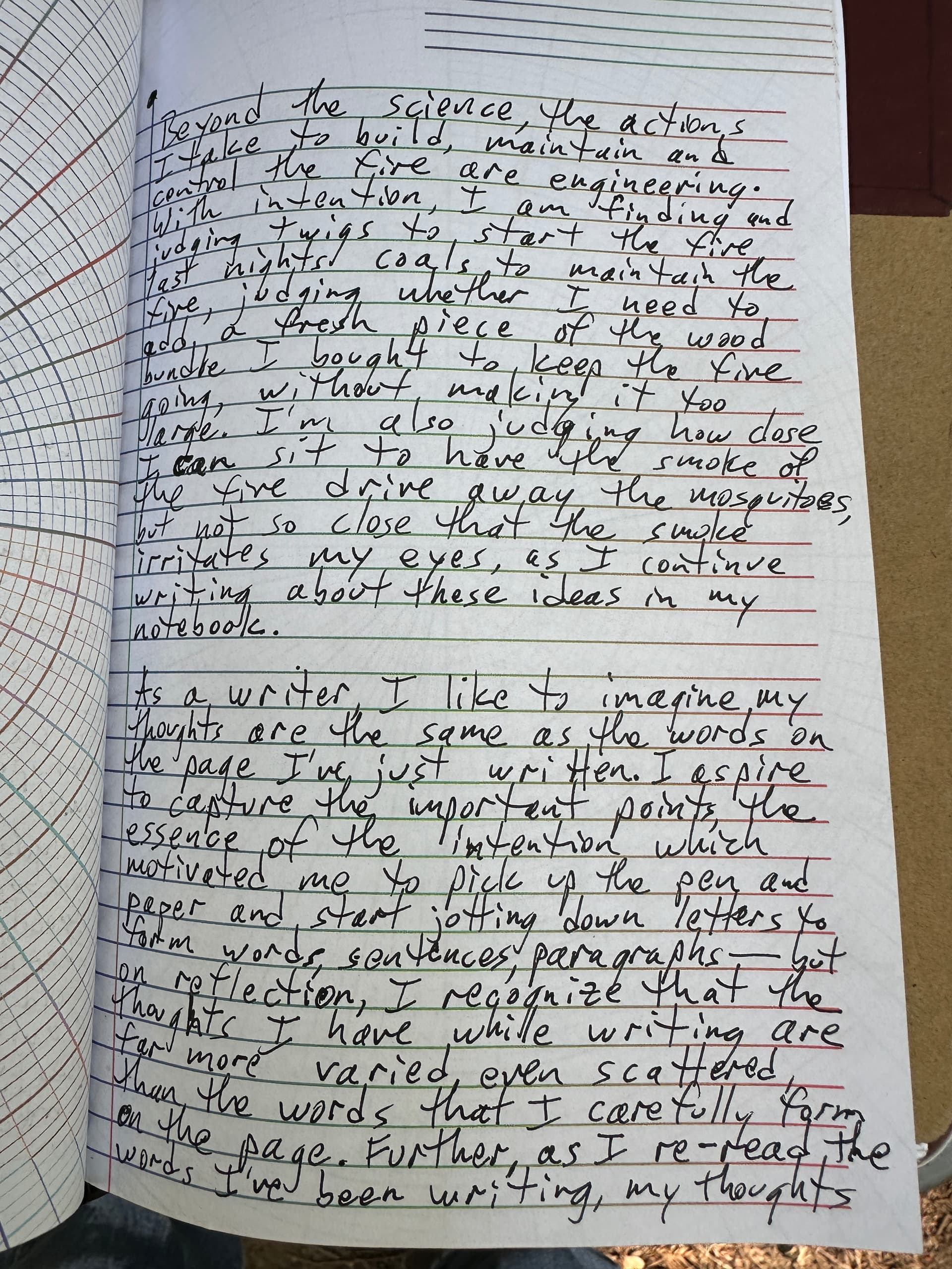 Beyond the science, the actions I take to build, maintain and control the fire are engineering. With intention I am finding and judging twigs to start the fire, the night’s coals to maintain the fire, judging whether I need to add a fresh piece of the wood bundle I brought to keep the fire going without making it too large. I’m also judging how close to the fire I sit to have the smoke of the fire drive away the mosquitoes, but not so close that the smoke irritates my eyes, as I continue writing about these ideas in my notebook.