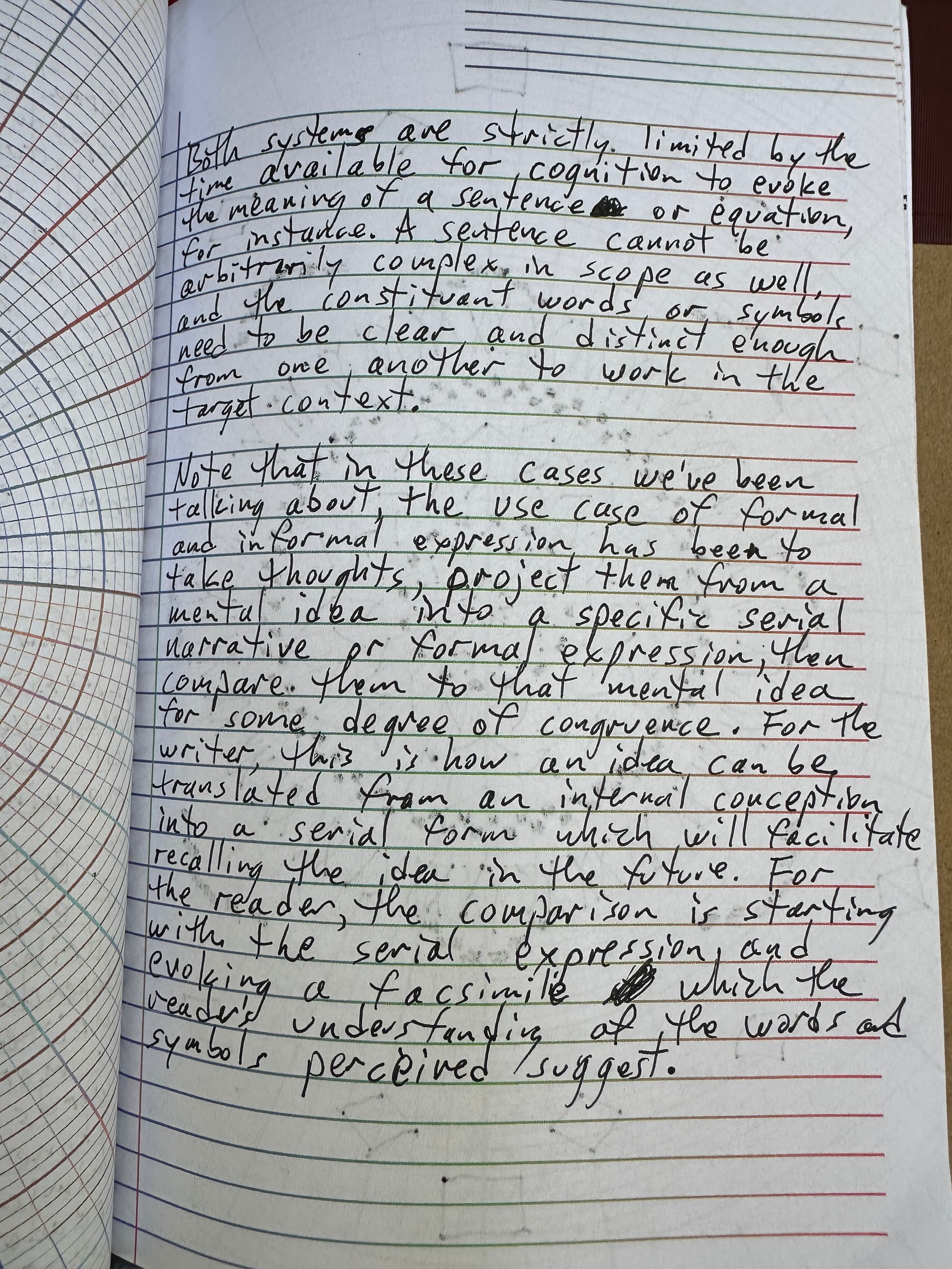 Note that in these cases we’ve been talking about the use case of formal and informal expression has been to take thoughts, project them from a mental idea into a specific serial narrative or formal expression, then compare them to that mental idea for some degree of congruence. For the writer, this is how an idea can be translated from an internal conception into a serial form which will facilitate recalling the idea in the future. For the reader, the comparison is starting with the serial expression and evoking a facsimile of the idea which the reader’s understanding of the words and symbols perceived suggest.