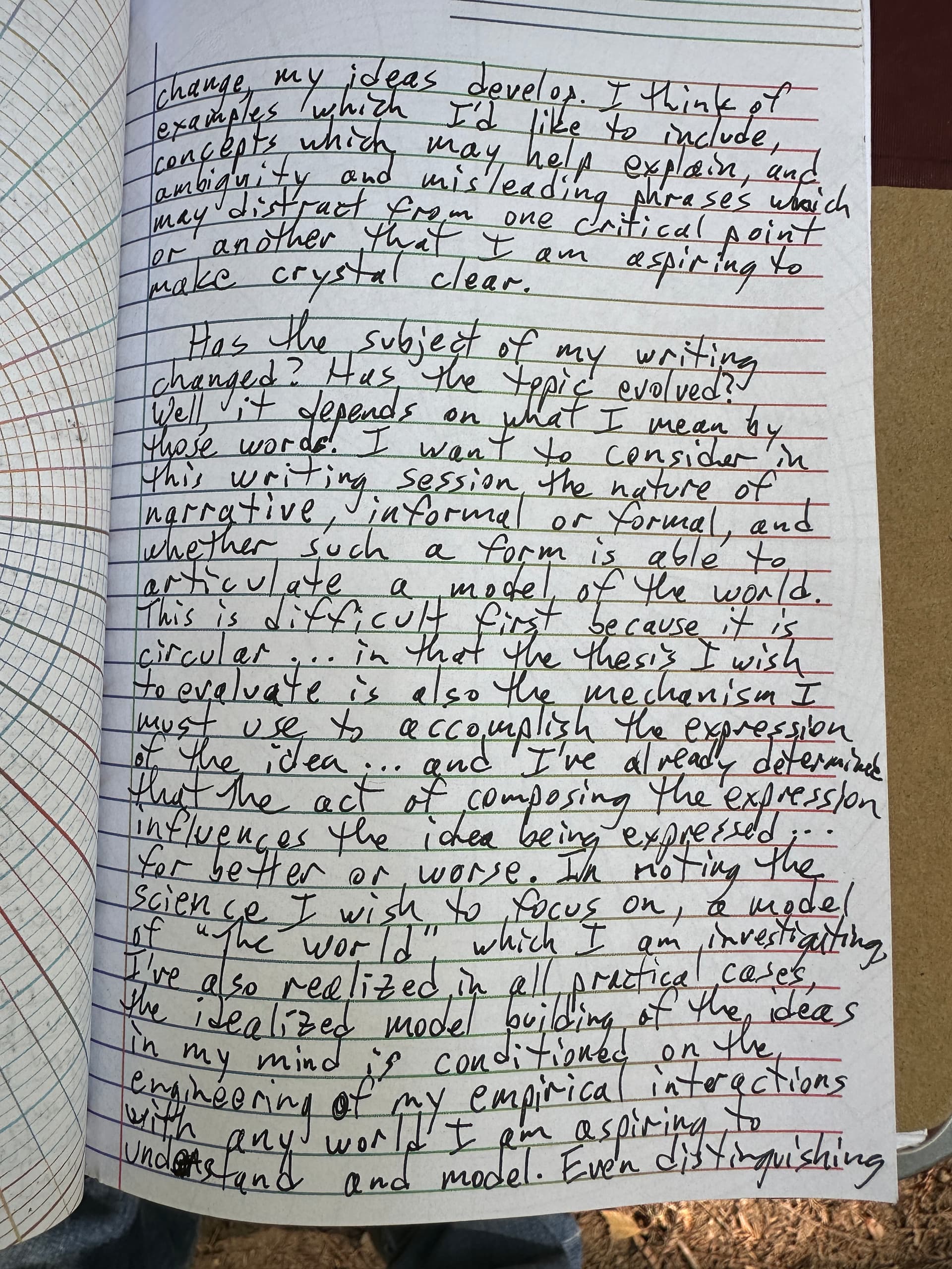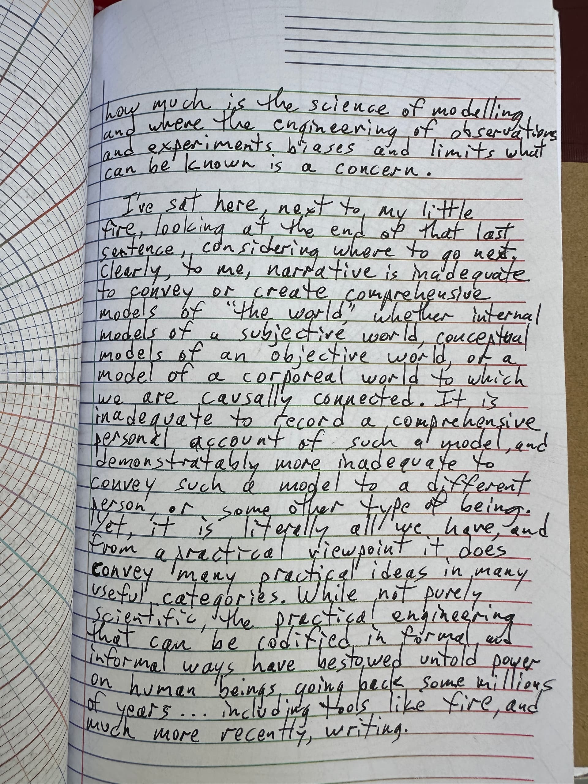 Has the subject of my writing changed? Has the topic evolved? Well, it depends on what I mean by those words. I want to consider in this writing session the nature of narrative, informal or formal, and whether such a form is able to articulate a model of the world. This is difficult, first because it is circular, in that the thesis I wish to evaluate is also the mechanism I must use to accomplish the expression of the idea… and I’ve already determined that the act of composing the expression influences the idea being expressed, for better or worse. In noting the science, I wish to focus on a model of “the world” which I am investigating. I’ve also realized in all practical cases, the idealized model building of the ideas in my mind is conditioned on the engineering of my empirical interactions with any world I am aspiring to understand and model. Even distinguishing