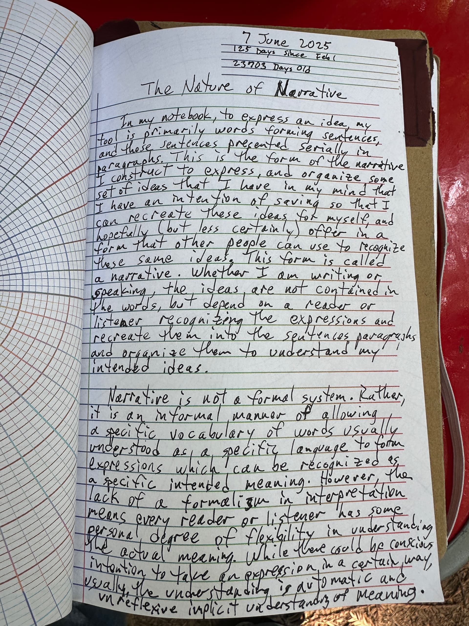 In my notebook, to express an idea, my tool is primarily words forming sentences, and those sentences presented serially in paragraphs. This is the form of the narrative construct to express and organize some set of ideas that I have in my mind that I have an intention of saving so that I can recreate these ideas for myself and (hopefully but less certainly) offer in a form that other people can use to recognize these same ideas. This form is called a narrative. Whether I am writing or speaking, the ideas are not contained in the words, but depend on a reader or listener recognizing the expressions and recreating them into the sentences, paragraphs and organize them to understand my intended ideas.