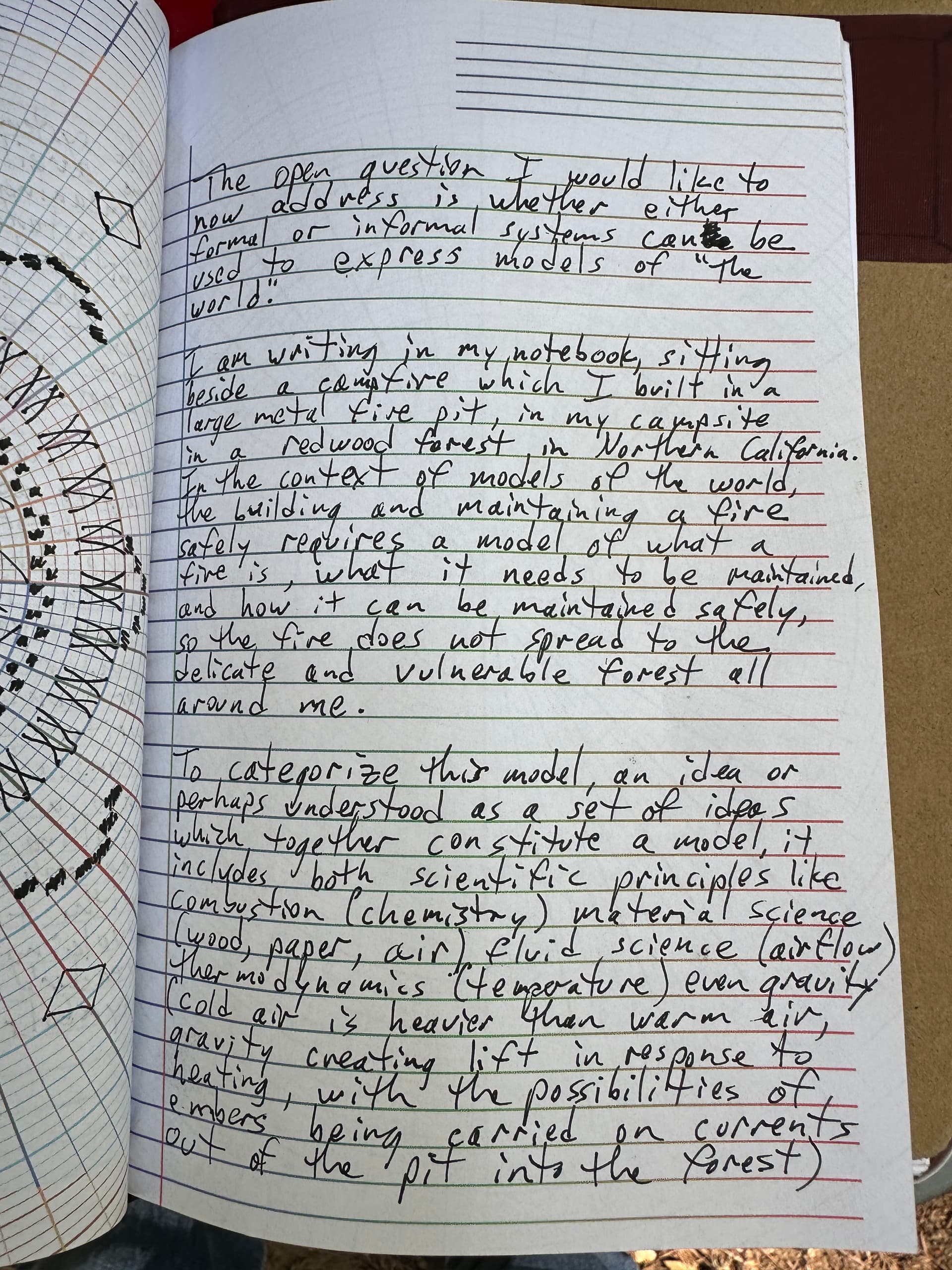 I am writing in my notebook, sitting beside a campfire which I built in a large metal fire pit, in my campsite in a redwood forest in Northern California. In the context of models of the world, the building and maintaining of a fire safely requires a model of what a fire is, what it needs to be maintained, and how it can be maintained safely so the fire does not spread to the delicate and vulnerable forest all around me.
